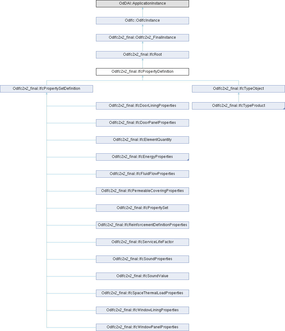 Reimplemented in OdIfc2x2_final::IfcActuatorType, OdIfc2x2_final::IfcAirTerminalBoxType, OdIfc2x2_final::IfcAirTerminalType, OdIfc2x2_final::IfcAirToAirHeatRecoveryType, OdIfc2x2_final::IfcAlarmType, OdIfc2x2_final::IfcBeamType, OdIfc2x2_final::IfcBoilerType, OdIfc2x2_final::IfcBuildingElementComponentType, OdIfc2x2_final::IfcBuildingElementType, OdIfc2x2_final::IfcCableCarrierFittingType, OdIfc2x2_final::IfcCableCarrierSegmentType, OdIfc2x2_final::IfcCableSegmentType, OdIfc2x2_final::IfcChillerType, OdIfc2x2_final::IfcCoilType, OdIfc2x2_final::IfcColumnType, OdIfc2x2_final::IfcCompressorType, OdIfc2x2_final::IfcCondenserType, OdIfc2x2_final::IfcControllerType, OdIfc2x2_final::IfcCooledBeamType, OdIfc2x2_final::IfcCoolingTowerType, OdIfc2x2_final::IfcCoveringType, OdIfc2x2_final::IfcDamperType, OdIfc2x2_final::IfcDiscreteAccessoryType, OdIfc2x2_final::IfcDistributionChamberElementType, OdIfc2x2_final::IfcDistributionControlElementType, OdIfc2x2_final::IfcDistributionElementType, OdIfc2x2_final::IfcDistributionFlowElementType, OdIfc2x2_final::IfcDoorLiningProperties, OdIfc2x2_final::IfcDoorPanelProperties, OdIfc2x2_final::IfcDoorStyle, OdIfc2x2_final::IfcDuctFittingType, OdIfc2x2_final::IfcDuctSegmentType, OdIfc2x2_final::IfcDuctSilencerType, OdIfc2x2_final::IfcElectricalBaseProperties, OdIfc2x2_final::IfcElectricApplianceType, OdIfc2x2_final::IfcElectricFlowStorageDeviceType, OdIfc2x2_final::IfcElectricGeneratorType, OdIfc2x2_final::IfcElectricHeaterType, OdIfc2x2_final::IfcElectricMotorType, OdIfc2x2_final::IfcElectricTimeControlType, OdIfc2x2_final::IfcElementComponentType, OdIfc2x2_final::IfcElementQuantity, OdIfc2x2_final::IfcElementType, OdIfc2x2_final::IfcEnergyConversionDeviceType, OdIfc2x2_final::IfcEnergyProperties, OdIfc2x2_final::IfcEvaporativeCoolerType, OdIfc2x2_final::IfcEvaporatorType, OdIfc2x2_final::IfcFanType, OdIfc2x2_final::IfcFastenerType, OdIfc2x2_final::IfcFilterType, OdIfc2x2_final::IfcFireSuppressionTerminalType, OdIfc2x2_final::IfcFlowControllerType, OdIfc2x2_final::IfcFlowFittingType, OdIfc2x2_final::IfcFlowInstrumentType, OdIfc2x2_final::IfcFlowMeterType, OdIfc2x2_final::IfcFlowMovingDeviceType, OdIfc2x2_final::IfcFlowSegmentType, OdIfc2x2_final::IfcFlowStorageDeviceType, OdIfc2x2_final::IfcFlowTerminalType, OdIfc2x2_final::IfcFlowTreatmentDeviceType, OdIfc2x2_final::IfcFluidFlowProperties, OdIfc2x2_final::IfcFurnishingElementType, OdIfc2x2_final::IfcFurnitureType, OdIfc2x2_final::IfcGasTerminalType, OdIfc2x2_final::IfcHeatExchangerType, OdIfc2x2_final::IfcHumidifierType, OdIfc2x2_final::IfcJunctionBoxType, OdIfc2x2_final::IfcLampType, OdIfc2x2_final::IfcLightFixtureType, OdIfc2x2_final::IfcMechanicalFastenerType, OdIfc2x2_final::IfcMemberType, OdIfc2x2_final::IfcMotorConnectionType, OdIfc2x2_final::IfcOutletType, OdIfc2x2_final::IfcPermeableCoveringProperties, OdIfc2x2_final::IfcPipeFittingType, OdIfc2x2_final::IfcPipeSegmentType, OdIfc2x2_final::IfcPlateType, OdIfc2x2_final::IfcPropertySet, OdIfc2x2_final::IfcPropertySetDefinition, OdIfc2x2_final::IfcProtectiveDeviceType, OdIfc2x2_final::IfcPumpType, OdIfc2x2_final::IfcRailingType, OdIfc2x2_final::IfcRampFlightType, OdIfc2x2_final::IfcReinforcementDefinitionProperties, OdIfc2x2_final::IfcSanitaryTerminalType, OdIfc2x2_final::IfcSensorType, OdIfc2x2_final::IfcServiceLifeFactor, OdIfc2x2_final::IfcSlabType, OdIfc2x2_final::IfcSoundProperties, OdIfc2x2_final::IfcSoundValue, OdIfc2x2_final::IfcSpaceHeaterType, OdIfc2x2_final::IfcSpaceThermalLoadProperties, OdIfc2x2_final::IfcStackTerminalType, OdIfc2x2_final::IfcStairFlightType, OdIfc2x2_final::IfcSwitchingDeviceType, OdIfc2x2_final::IfcSystemFurnitureElementType, OdIfc2x2_final::IfcTankType, OdIfc2x2_final::IfcTransformerType, OdIfc2x2_final::IfcTransportElementType, OdIfc2x2_final::IfcTubeBundleType, OdIfc2x2_final::IfcTypeObject, OdIfc2x2_final::IfcTypeProduct, OdIfc2x2_final::IfcUnitaryEquipmentType, OdIfc2x2_final::IfcValveType, OdIfc2x2_final::IfcVibrationIsolatorType, OdIfc2x2_final::IfcWallType, OdIfc2x2_final::IfcWasteTerminalType, OdIfc2x2_final::IfcWindowLiningProperties, OdIfc2x2_final::IfcWindowPanelProperties, and OdIfc2x2_final::IfcWindowStyle.