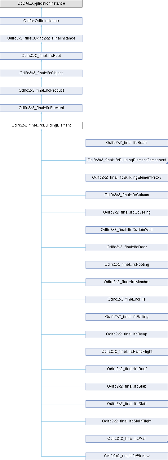 Reimplemented in OdIfc2x2_final::IfcBeam, OdIfc2x2_final::IfcBuildingElementComponent, OdIfc2x2_final::IfcBuildingElementPart, OdIfc2x2_final::IfcBuildingElementProxy, OdIfc2x2_final::IfcColumn, OdIfc2x2_final::IfcCovering, OdIfc2x2_final::IfcCurtainWall, OdIfc2x2_final::IfcDoor, OdIfc2x2_final::IfcFooting, OdIfc2x2_final::IfcMember, OdIfc2x2_final::IfcPile, OdIfc2x2_final::IfcPlate, OdIfc2x2_final::IfcRailing, OdIfc2x2_final::IfcRamp, OdIfc2x2_final::IfcRampFlight, OdIfc2x2_final::IfcReinforcingBar, OdIfc2x2_final::IfcReinforcingElement, OdIfc2x2_final::IfcReinforcingMesh, OdIfc2x2_final::IfcRoof, OdIfc2x2_final::IfcSlab, OdIfc2x2_final::IfcStair, OdIfc2x2_final::IfcStairFlight, OdIfc2x2_final::IfcTendon, OdIfc2x2_final::IfcTendonAnchor, OdIfc2x2_final::IfcWall, OdIfc2x2_final::IfcWallStandardCase, and OdIfc2x2_final::IfcWindow.