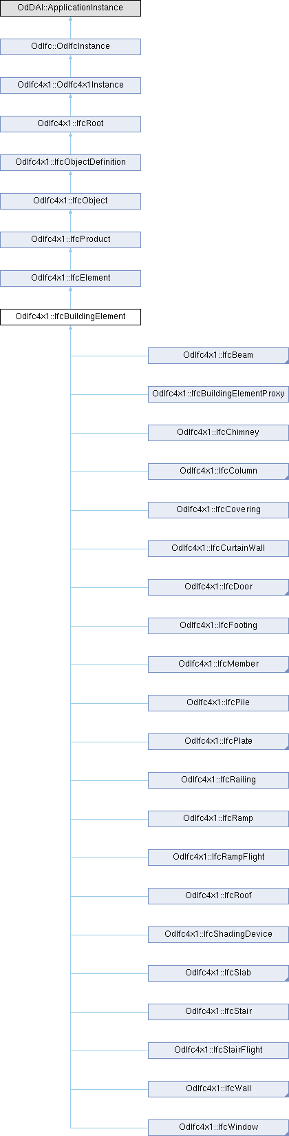Reimplemented in OdIfc4x1::IfcBeam, OdIfc4x1::IfcBeamStandardCase, OdIfc4x1::IfcBuildingElementProxy, OdIfc4x1::IfcChimney, OdIfc4x1::IfcColumn, OdIfc4x1::IfcColumnStandardCase, OdIfc4x1::IfcCovering, OdIfc4x1::IfcCurtainWall, OdIfc4x1::IfcDoor, OdIfc4x1::IfcDoorStandardCase, OdIfc4x1::IfcFooting, OdIfc4x1::IfcMember, OdIfc4x1::IfcMemberStandardCase, OdIfc4x1::IfcPile, OdIfc4x1::IfcPlate, OdIfc4x1::IfcPlateStandardCase, OdIfc4x1::IfcRailing, OdIfc4x1::IfcRamp, OdIfc4x1::IfcRampFlight, OdIfc4x1::IfcRoof, OdIfc4x1::IfcShadingDevice, OdIfc4x1::IfcSlab, OdIfc4x1::IfcSlabElementedCase, OdIfc4x1::IfcSlabStandardCase, OdIfc4x1::IfcStair, OdIfc4x1::IfcStairFlight, OdIfc4x1::IfcWall, OdIfc4x1::IfcWallElementedCase, OdIfc4x1::IfcWallStandardCase, OdIfc4x1::IfcWindow, and OdIfc4x1::IfcWindowStandardCase.