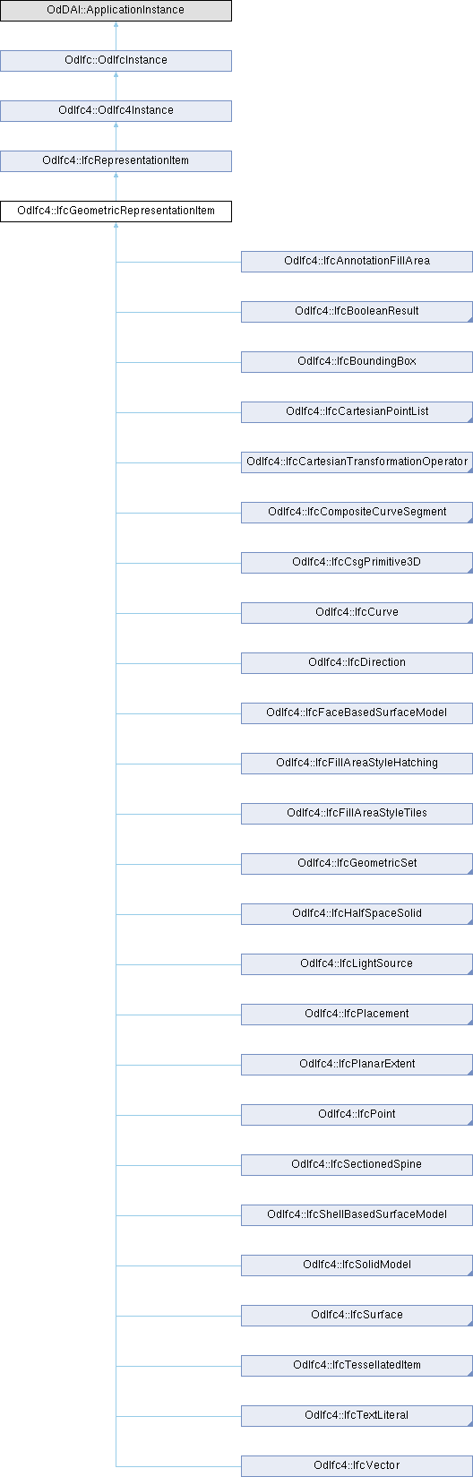 Reimplemented in OdIfc4::IfcAdvancedBrep, OdIfc4::IfcAdvancedBrepWithVoids, OdIfc4::IfcAnnotationFillArea, OdIfc4::IfcAxis1Placement, OdIfc4::IfcAxis2Placement2D, OdIfc4::IfcAxis2Placement3D, OdIfc4::IfcBlock, OdIfc4::IfcBooleanClippingResult, OdIfc4::IfcBooleanResult, OdIfc4::IfcBoundaryCurve, OdIfc4::IfcBoundedCurve, OdIfc4::IfcBoundedSurface, OdIfc4::IfcBoundingBox, OdIfc4::IfcBoxedHalfSpace, OdIfc4::IfcBSplineCurve, OdIfc4::IfcBSplineCurveWithKnots, OdIfc4::IfcBSplineSurface, OdIfc4::IfcBSplineSurfaceWithKnots, OdIfc4::IfcCartesianPoint, OdIfc4::IfcCartesianPointList2D, OdIfc4::IfcCartesianPointList3D, OdIfc4::IfcCartesianPointList, OdIfc4::IfcCartesianTransformationOperator2D, OdIfc4::IfcCartesianTransformationOperator2DnonUniform, OdIfc4::IfcCartesianTransformationOperator3D, OdIfc4::IfcCartesianTransformationOperator3DnonUniform, OdIfc4::IfcCartesianTransformationOperator, OdIfc4::IfcCircle, OdIfc4::IfcCompositeCurve, OdIfc4::IfcCompositeCurveOnSurface, OdIfc4::IfcCompositeCurveSegment, OdIfc4::IfcConic, OdIfc4::IfcCsgPrimitive3D, OdIfc4::IfcCsgSolid, OdIfc4::IfcCurve, OdIfc4::IfcCurveBoundedPlane, OdIfc4::IfcCurveBoundedSurface, OdIfc4::IfcCylindricalSurface, OdIfc4::IfcDirection, OdIfc4::IfcElementarySurface, OdIfc4::IfcEllipse, OdIfc4::IfcExtrudedAreaSolid, OdIfc4::IfcExtrudedAreaSolidTapered, OdIfc4::IfcFaceBasedSurfaceModel, OdIfc4::IfcFacetedBrep, OdIfc4::IfcFacetedBrepWithVoids, OdIfc4::IfcFillAreaStyleHatching, OdIfc4::IfcFillAreaStyleTiles, OdIfc4::IfcFixedReferenceSweptAreaSolid, OdIfc4::IfcGeometricCurveSet, OdIfc4::IfcGeometricSet, OdIfc4::IfcHalfSpaceSolid, OdIfc4::IfcIndexedPolyCurve, OdIfc4::IfcIndexedPolygonalFace, OdIfc4::IfcIndexedPolygonalFaceWithVoids, OdIfc4::IfcIntersectionCurve, OdIfc4::IfcLightSource, OdIfc4::IfcLightSourceAmbient, OdIfc4::IfcLightSourceDirectional, OdIfc4::IfcLightSourceGoniometric, OdIfc4::IfcLightSourcePositional, OdIfc4::IfcLightSourceSpot, OdIfc4::IfcLine, OdIfc4::IfcManifoldSolidBrep, OdIfc4::IfcOffsetCurve2D, OdIfc4::IfcOffsetCurve3D, OdIfc4::IfcOuterBoundaryCurve, OdIfc4::IfcPcurve, OdIfc4::IfcPlacement, OdIfc4::IfcPlanarBox, OdIfc4::IfcPlanarExtent, OdIfc4::IfcPlane, OdIfc4::IfcPoint, OdIfc4::IfcPointOnCurve, OdIfc4::IfcPointOnSurface, OdIfc4::IfcPolygonalBoundedHalfSpace, OdIfc4::IfcPolygonalFaceSet, OdIfc4::IfcPolyline, OdIfc4::IfcRationalBSplineCurveWithKnots, OdIfc4::IfcRationalBSplineSurfaceWithKnots, OdIfc4::IfcRectangularPyramid, OdIfc4::IfcRectangularTrimmedSurface, OdIfc4::IfcReparametrisedCompositeCurveSegment, OdIfc4::IfcRevolvedAreaSolid, OdIfc4::IfcRevolvedAreaSolidTapered, OdIfc4::IfcRightCircularCone, OdIfc4::IfcRightCircularCylinder, OdIfc4::IfcSeamCurve, OdIfc4::IfcSectionedSpine, OdIfc4::IfcShellBasedSurfaceModel, OdIfc4::IfcSolidModel, OdIfc4::IfcSphere, OdIfc4::IfcSphericalSurface, OdIfc4::IfcSurface, OdIfc4::IfcSurfaceCurve, OdIfc4::IfcSurfaceCurveSweptAreaSolid, OdIfc4::IfcSurfaceOfLinearExtrusion, OdIfc4::IfcSurfaceOfRevolution, OdIfc4::IfcSweptAreaSolid, OdIfc4::IfcSweptDiskSolid, OdIfc4::IfcSweptDiskSolidPolygonal, OdIfc4::IfcSweptSurface, OdIfc4::IfcTessellatedFaceSet, OdIfc4::IfcTessellatedItem, OdIfc4::IfcTextLiteral, OdIfc4::IfcTextLiteralWithExtent, OdIfc4::IfcToroidalSurface, OdIfc4::IfcTriangulatedFaceSet, OdIfc4::IfcTrimmedCurve, and OdIfc4::IfcVector.