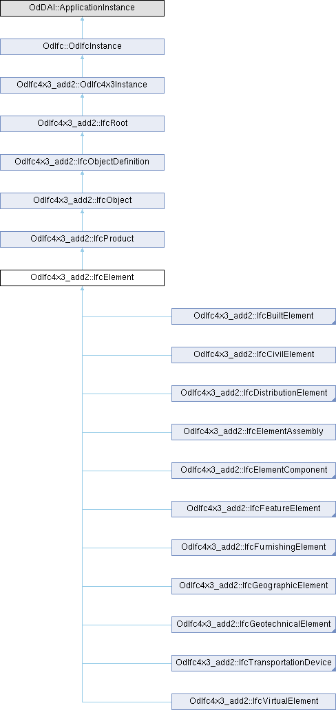 Reimplemented in OdIfc4x3_add2::IfcActuator, OdIfc4x3_add2::IfcAirTerminal, OdIfc4x3_add2::IfcAirTerminalBox, OdIfc4x3_add2::IfcAirToAirHeatRecovery, OdIfc4x3_add2::IfcAlarm, OdIfc4x3_add2::IfcAudioVisualAppliance, OdIfc4x3_add2::IfcBeam, OdIfc4x3_add2::IfcBearing, OdIfc4x3_add2::IfcBoiler, OdIfc4x3_add2::IfcBorehole, OdIfc4x3_add2::IfcBuildingElementPart, OdIfc4x3_add2::IfcBuildingElementProxy, OdIfc4x3_add2::IfcBuiltElement, OdIfc4x3_add2::IfcBurner, OdIfc4x3_add2::IfcCableCarrierFitting, OdIfc4x3_add2::IfcCableCarrierSegment, OdIfc4x3_add2::IfcCableFitting, OdIfc4x3_add2::IfcCableSegment, OdIfc4x3_add2::IfcCaissonFoundation, OdIfc4x3_add2::IfcChiller, OdIfc4x3_add2::IfcChimney, OdIfc4x3_add2::IfcCivilElement, OdIfc4x3_add2::IfcCoil, OdIfc4x3_add2::IfcColumn, OdIfc4x3_add2::IfcCommunicationsAppliance, OdIfc4x3_add2::IfcCompressor, OdIfc4x3_add2::IfcCondenser, OdIfc4x3_add2::IfcController, OdIfc4x3_add2::IfcConveyorSegment, OdIfc4x3_add2::IfcCooledBeam, OdIfc4x3_add2::IfcCoolingTower, OdIfc4x3_add2::IfcCourse, OdIfc4x3_add2::IfcCovering, OdIfc4x3_add2::IfcCurtainWall, OdIfc4x3_add2::IfcDamper, OdIfc4x3_add2::IfcDeepFoundation, OdIfc4x3_add2::IfcDiscreteAccessory, OdIfc4x3_add2::IfcDistributionBoard, OdIfc4x3_add2::IfcDistributionChamberElement, OdIfc4x3_add2::IfcDistributionControlElement, OdIfc4x3_add2::IfcDistributionElement, OdIfc4x3_add2::IfcDistributionFlowElement, OdIfc4x3_add2::IfcDoor, OdIfc4x3_add2::IfcDuctFitting, OdIfc4x3_add2::IfcDuctSegment, OdIfc4x3_add2::IfcDuctSilencer, OdIfc4x3_add2::IfcEarthworksCut, OdIfc4x3_add2::IfcEarthworksElement, OdIfc4x3_add2::IfcEarthworksFill, OdIfc4x3_add2::IfcElectricAppliance, OdIfc4x3_add2::IfcElectricDistributionBoard, OdIfc4x3_add2::IfcElectricFlowStorageDevice, OdIfc4x3_add2::IfcElectricFlowTreatmentDevice, OdIfc4x3_add2::IfcElectricGenerator, OdIfc4x3_add2::IfcElectricMotor, OdIfc4x3_add2::IfcElectricTimeControl, OdIfc4x3_add2::IfcElementAssembly, OdIfc4x3_add2::IfcElementComponent, OdIfc4x3_add2::IfcEnergyConversionDevice, OdIfc4x3_add2::IfcEngine, OdIfc4x3_add2::IfcEvaporativeCooler, OdIfc4x3_add2::IfcEvaporator, OdIfc4x3_add2::IfcFan, OdIfc4x3_add2::IfcFastener, OdIfc4x3_add2::IfcFeatureElement, OdIfc4x3_add2::IfcFeatureElementAddition, OdIfc4x3_add2::IfcFeatureElementSubtraction, OdIfc4x3_add2::IfcFilter, OdIfc4x3_add2::IfcFireSuppressionTerminal, OdIfc4x3_add2::IfcFlowController, OdIfc4x3_add2::IfcFlowFitting, OdIfc4x3_add2::IfcFlowInstrument, OdIfc4x3_add2::IfcFlowMeter, OdIfc4x3_add2::IfcFlowMovingDevice, OdIfc4x3_add2::IfcFlowSegment, OdIfc4x3_add2::IfcFlowStorageDevice, OdIfc4x3_add2::IfcFlowTerminal, OdIfc4x3_add2::IfcFlowTreatmentDevice, OdIfc4x3_add2::IfcFooting, OdIfc4x3_add2::IfcFurnishingElement, OdIfc4x3_add2::IfcFurniture, OdIfc4x3_add2::IfcGeographicElement, OdIfc4x3_add2::IfcGeomodel, OdIfc4x3_add2::IfcGeoslice, OdIfc4x3_add2::IfcGeotechnicalAssembly, OdIfc4x3_add2::IfcGeotechnicalElement, OdIfc4x3_add2::IfcGeotechnicalStratum, OdIfc4x3_add2::IfcHeatExchanger, OdIfc4x3_add2::IfcHumidifier, OdIfc4x3_add2::IfcImpactProtectionDevice, OdIfc4x3_add2::IfcInterceptor, OdIfc4x3_add2::IfcJunctionBox, OdIfc4x3_add2::IfcKerb, OdIfc4x3_add2::IfcLamp, OdIfc4x3_add2::IfcLightFixture, OdIfc4x3_add2::IfcLiquidTerminal, OdIfc4x3_add2::IfcMechanicalFastener, OdIfc4x3_add2::IfcMedicalDevice, OdIfc4x3_add2::IfcMember, OdIfc4x3_add2::IfcMobileTelecommunicationsAppliance, OdIfc4x3_add2::IfcMooringDevice, OdIfc4x3_add2::IfcMotorConnection, OdIfc4x3_add2::IfcNavigationElement, OdIfc4x3_add2::IfcOpeningElement, OdIfc4x3_add2::IfcOutlet, OdIfc4x3_add2::IfcPavement, OdIfc4x3_add2::IfcPile, OdIfc4x3_add2::IfcPipeFitting, OdIfc4x3_add2::IfcPipeSegment, OdIfc4x3_add2::IfcPlate, OdIfc4x3_add2::IfcProjectionElement, OdIfc4x3_add2::IfcProtectiveDevice, OdIfc4x3_add2::IfcProtectiveDeviceTrippingUnit, OdIfc4x3_add2::IfcPump, OdIfc4x3_add2::IfcRail, OdIfc4x3_add2::IfcRailing, OdIfc4x3_add2::IfcRamp, OdIfc4x3_add2::IfcRampFlight, OdIfc4x3_add2::IfcReinforcedSoil, OdIfc4x3_add2::IfcReinforcingBar, OdIfc4x3_add2::IfcReinforcingElement, OdIfc4x3_add2::IfcReinforcingMesh, OdIfc4x3_add2::IfcRoof, OdIfc4x3_add2::IfcSanitaryTerminal, OdIfc4x3_add2::IfcSensor, OdIfc4x3_add2::IfcShadingDevice, OdIfc4x3_add2::IfcSign, OdIfc4x3_add2::IfcSignal, OdIfc4x3_add2::IfcSlab, OdIfc4x3_add2::IfcSolarDevice, OdIfc4x3_add2::IfcSpaceHeater, OdIfc4x3_add2::IfcStackTerminal, OdIfc4x3_add2::IfcStair, OdIfc4x3_add2::IfcStairFlight, OdIfc4x3_add2::IfcSurfaceFeature, OdIfc4x3_add2::IfcSwitchingDevice, OdIfc4x3_add2::IfcSystemFurnitureElement, OdIfc4x3_add2::IfcTank, OdIfc4x3_add2::IfcTendon, OdIfc4x3_add2::IfcTendonAnchor, OdIfc4x3_add2::IfcTendonConduit, OdIfc4x3_add2::IfcTrackElement, OdIfc4x3_add2::IfcTransformer, OdIfc4x3_add2::IfcTransportationDevice, OdIfc4x3_add2::IfcTransportElement, OdIfc4x3_add2::IfcTubeBundle, OdIfc4x3_add2::IfcUnitaryControlElement, OdIfc4x3_add2::IfcUnitaryEquipment, OdIfc4x3_add2::IfcValve, OdIfc4x3_add2::IfcVehicle, OdIfc4x3_add2::IfcVibrationDamper, OdIfc4x3_add2::IfcVibrationIsolator, OdIfc4x3_add2::IfcVirtualElement, OdIfc4x3_add2::IfcVoidingFeature, OdIfc4x3_add2::IfcWall, OdIfc4x3_add2::IfcWallStandardCase, OdIfc4x3_add2::IfcWasteTerminal, and OdIfc4x3_add2::IfcWindow.
