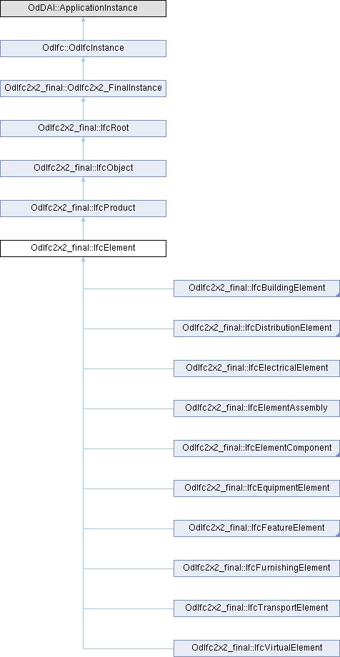 Reimplemented in OdIfc2x2_final::IfcBeam, OdIfc2x2_final::IfcBuildingElement, OdIfc2x2_final::IfcBuildingElementComponent, OdIfc2x2_final::IfcBuildingElementPart, OdIfc2x2_final::IfcBuildingElementProxy, OdIfc2x2_final::IfcChamferEdgeFeature, OdIfc2x2_final::IfcColumn, OdIfc2x2_final::IfcCovering, OdIfc2x2_final::IfcCurtainWall, OdIfc2x2_final::IfcDiscreteAccessory, OdIfc2x2_final::IfcDistributionChamberElement, OdIfc2x2_final::IfcDistributionControlElement, OdIfc2x2_final::IfcDistributionElement, OdIfc2x2_final::IfcDistributionFlowElement, OdIfc2x2_final::IfcDoor, OdIfc2x2_final::IfcEdgeFeature, OdIfc2x2_final::IfcElectricalElement, OdIfc2x2_final::IfcElectricDistributionPoint, OdIfc2x2_final::IfcElementAssembly, OdIfc2x2_final::IfcElementComponent, OdIfc2x2_final::IfcEnergyConversionDevice, OdIfc2x2_final::IfcEquipmentElement, OdIfc2x2_final::IfcFastener, OdIfc2x2_final::IfcFeatureElement, OdIfc2x2_final::IfcFeatureElementAddition, OdIfc2x2_final::IfcFeatureElementSubtraction, OdIfc2x2_final::IfcFlowController, OdIfc2x2_final::IfcFlowFitting, OdIfc2x2_final::IfcFlowMovingDevice, OdIfc2x2_final::IfcFlowSegment, OdIfc2x2_final::IfcFlowStorageDevice, OdIfc2x2_final::IfcFlowTerminal, OdIfc2x2_final::IfcFlowTreatmentDevice, OdIfc2x2_final::IfcFooting, OdIfc2x2_final::IfcFurnishingElement, OdIfc2x2_final::IfcMechanicalFastener, OdIfc2x2_final::IfcMember, OdIfc2x2_final::IfcOpeningElement, OdIfc2x2_final::IfcPile, OdIfc2x2_final::IfcPlate, OdIfc2x2_final::IfcProjectionElement, OdIfc2x2_final::IfcRailing, OdIfc2x2_final::IfcRamp, OdIfc2x2_final::IfcRampFlight, OdIfc2x2_final::IfcReinforcingBar, OdIfc2x2_final::IfcReinforcingElement, OdIfc2x2_final::IfcReinforcingMesh, OdIfc2x2_final::IfcRoof, OdIfc2x2_final::IfcRoundedEdgeFeature, OdIfc2x2_final::IfcSlab, OdIfc2x2_final::IfcStair, OdIfc2x2_final::IfcStairFlight, OdIfc2x2_final::IfcTendon, OdIfc2x2_final::IfcTendonAnchor, OdIfc2x2_final::IfcTransportElement, OdIfc2x2_final::IfcVirtualElement, OdIfc2x2_final::IfcWall, OdIfc2x2_final::IfcWallStandardCase, and OdIfc2x2_final::IfcWindow.