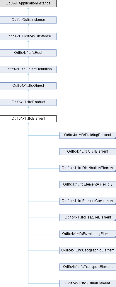 Reimplemented in OdIfc4x1::IfcActuator, OdIfc4x1::IfcAirTerminal, OdIfc4x1::IfcAirTerminalBox, OdIfc4x1::IfcAirToAirHeatRecovery, OdIfc4x1::IfcAlarm, OdIfc4x1::IfcAudioVisualAppliance, OdIfc4x1::IfcBeam, OdIfc4x1::IfcBeamStandardCase, OdIfc4x1::IfcBoiler, OdIfc4x1::IfcBuildingElement, OdIfc4x1::IfcBuildingElementPart, OdIfc4x1::IfcBuildingElementProxy, OdIfc4x1::IfcBurner, OdIfc4x1::IfcCableCarrierFitting, OdIfc4x1::IfcCableCarrierSegment, OdIfc4x1::IfcCableFitting, OdIfc4x1::IfcCableSegment, OdIfc4x1::IfcChiller, OdIfc4x1::IfcChimney, OdIfc4x1::IfcCivilElement, OdIfc4x1::IfcCoil, OdIfc4x1::IfcColumn, OdIfc4x1::IfcColumnStandardCase, OdIfc4x1::IfcCommunicationsAppliance, OdIfc4x1::IfcCompressor, OdIfc4x1::IfcCondenser, OdIfc4x1::IfcController, OdIfc4x1::IfcCooledBeam, OdIfc4x1::IfcCoolingTower, OdIfc4x1::IfcCovering, OdIfc4x1::IfcCurtainWall, OdIfc4x1::IfcDamper, OdIfc4x1::IfcDiscreteAccessory, OdIfc4x1::IfcDistributionChamberElement, OdIfc4x1::IfcDistributionControlElement, OdIfc4x1::IfcDistributionElement, OdIfc4x1::IfcDistributionFlowElement, OdIfc4x1::IfcDoor, OdIfc4x1::IfcDoorStandardCase, OdIfc4x1::IfcDuctFitting, OdIfc4x1::IfcDuctSegment, OdIfc4x1::IfcDuctSilencer, OdIfc4x1::IfcElectricAppliance, OdIfc4x1::IfcElectricDistributionBoard, OdIfc4x1::IfcElectricFlowStorageDevice, OdIfc4x1::IfcElectricGenerator, OdIfc4x1::IfcElectricMotor, OdIfc4x1::IfcElectricTimeControl, OdIfc4x1::IfcElementAssembly, OdIfc4x1::IfcElementComponent, OdIfc4x1::IfcEnergyConversionDevice, OdIfc4x1::IfcEngine, OdIfc4x1::IfcEvaporativeCooler, OdIfc4x1::IfcEvaporator, OdIfc4x1::IfcFan, OdIfc4x1::IfcFastener, OdIfc4x1::IfcFeatureElement, OdIfc4x1::IfcFeatureElementAddition, OdIfc4x1::IfcFeatureElementSubtraction, OdIfc4x1::IfcFilter, OdIfc4x1::IfcFireSuppressionTerminal, OdIfc4x1::IfcFlowController, OdIfc4x1::IfcFlowFitting, OdIfc4x1::IfcFlowInstrument, OdIfc4x1::IfcFlowMeter, OdIfc4x1::IfcFlowMovingDevice, OdIfc4x1::IfcFlowSegment, OdIfc4x1::IfcFlowStorageDevice, OdIfc4x1::IfcFlowTerminal, OdIfc4x1::IfcFlowTreatmentDevice, OdIfc4x1::IfcFooting, OdIfc4x1::IfcFurnishingElement, OdIfc4x1::IfcFurniture, OdIfc4x1::IfcGeographicElement, OdIfc4x1::IfcHeatExchanger, OdIfc4x1::IfcHumidifier, OdIfc4x1::IfcInterceptor, OdIfc4x1::IfcJunctionBox, OdIfc4x1::IfcLamp, OdIfc4x1::IfcLightFixture, OdIfc4x1::IfcMechanicalFastener, OdIfc4x1::IfcMedicalDevice, OdIfc4x1::IfcMember, OdIfc4x1::IfcMemberStandardCase, OdIfc4x1::IfcMotorConnection, OdIfc4x1::IfcOpeningElement, OdIfc4x1::IfcOpeningStandardCase, OdIfc4x1::IfcOutlet, OdIfc4x1::IfcPile, OdIfc4x1::IfcPipeFitting, OdIfc4x1::IfcPipeSegment, OdIfc4x1::IfcPlate, OdIfc4x1::IfcPlateStandardCase, OdIfc4x1::IfcProjectionElement, OdIfc4x1::IfcProtectiveDevice, OdIfc4x1::IfcProtectiveDeviceTrippingUnit, OdIfc4x1::IfcPump, OdIfc4x1::IfcRailing, OdIfc4x1::IfcRamp, OdIfc4x1::IfcRampFlight, OdIfc4x1::IfcReinforcingBar, OdIfc4x1::IfcReinforcingElement, OdIfc4x1::IfcReinforcingMesh, OdIfc4x1::IfcRoof, OdIfc4x1::IfcSanitaryTerminal, OdIfc4x1::IfcSensor, OdIfc4x1::IfcShadingDevice, OdIfc4x1::IfcSlab, OdIfc4x1::IfcSlabElementedCase, OdIfc4x1::IfcSlabStandardCase, OdIfc4x1::IfcSolarDevice, OdIfc4x1::IfcSpaceHeater, OdIfc4x1::IfcStackTerminal, OdIfc4x1::IfcStair, OdIfc4x1::IfcStairFlight, OdIfc4x1::IfcSurfaceFeature, OdIfc4x1::IfcSwitchingDevice, OdIfc4x1::IfcSystemFurnitureElement, OdIfc4x1::IfcTank, OdIfc4x1::IfcTendon, OdIfc4x1::IfcTendonAnchor, OdIfc4x1::IfcTransformer, OdIfc4x1::IfcTransportElement, OdIfc4x1::IfcTubeBundle, OdIfc4x1::IfcUnitaryControlElement, OdIfc4x1::IfcUnitaryEquipment, OdIfc4x1::IfcValve, OdIfc4x1::IfcVibrationIsolator, OdIfc4x1::IfcVirtualElement, OdIfc4x1::IfcVoidingFeature, OdIfc4x1::IfcWall, OdIfc4x1::IfcWallElementedCase, OdIfc4x1::IfcWallStandardCase, OdIfc4x1::IfcWasteTerminal, OdIfc4x1::IfcWindow, and OdIfc4x1::IfcWindowStandardCase.